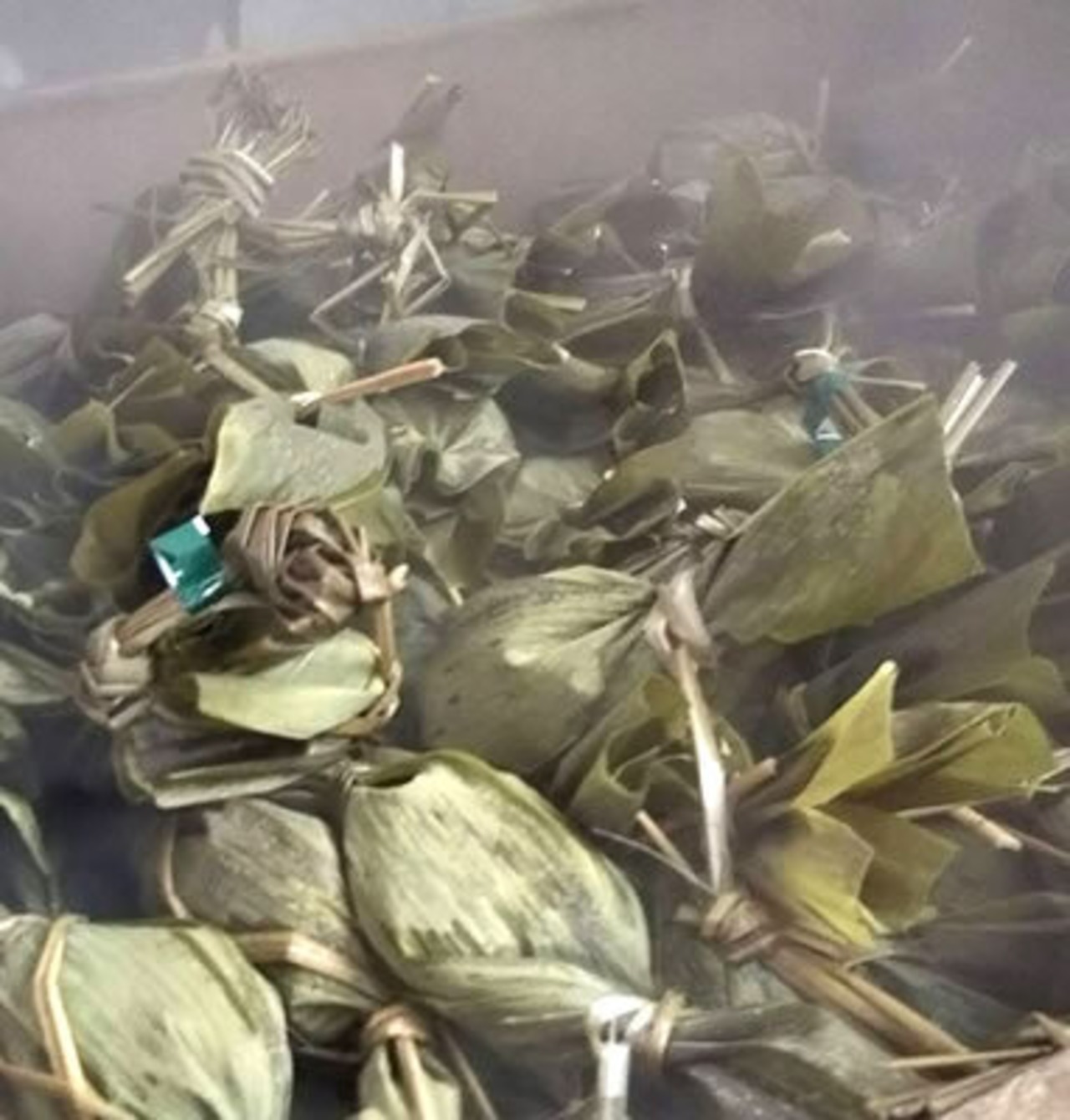 笹団子の生地は越後米のもち粉等を独自にブレンドした粉を使用し、初春の新芽のヨモギをふんだんに入れ、生地につきあげます。ほどよくつき上げた生地に餡を包み、1つ1つ3枚の笹にくるみスゲで縛り上げます。高圧な蒸し窯で蒸し上げた笹団子は、柔らかくコシのある「昔懐かしい田舎のおふくろの味を思い出す」と、お客様から好評をいただいております。